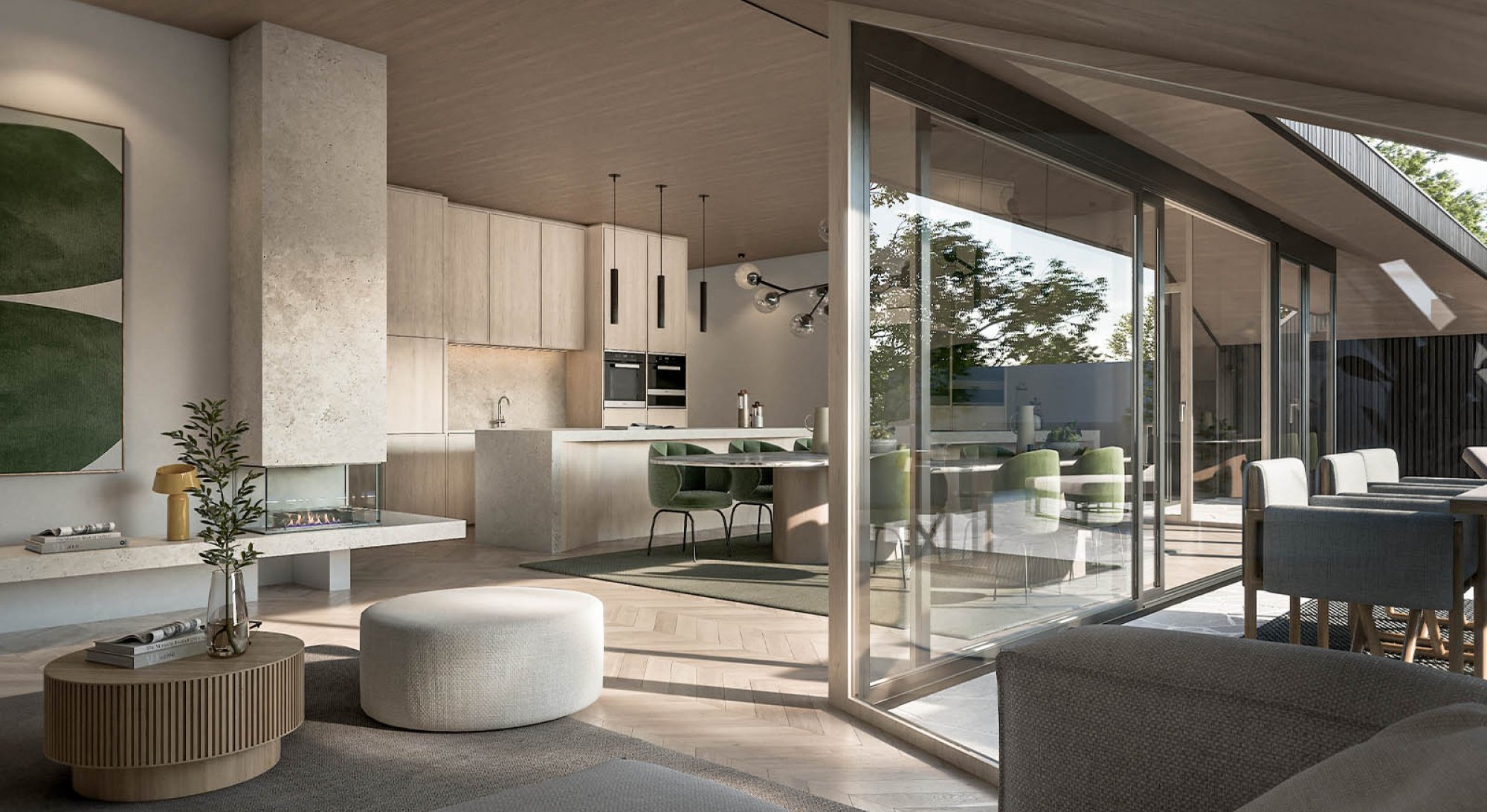 The large windows, many of which have sliding doors, create a smooth transition between the indoor and outdoor areas. The interior features a stylish color scheme, the finest materials such as elegant oak parquet flooring, large-format porcelain stoneware, and a well-thought-out lighting design.